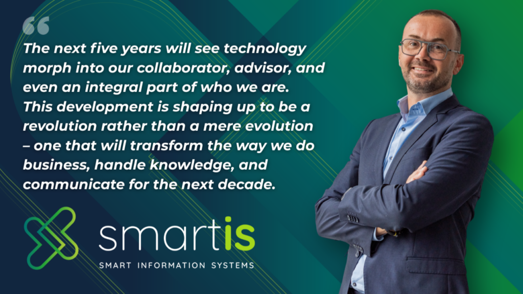 The next five years will see technology morph into our collaborator, advisor, and even an integral part of who we are. This development is shaping up to be a revolution rather than a mere evolution – one that will transform the way we do business, handle knowledge, and communicate for the next decade.To me, several trends stand out as crucial for shaping IT services, corporate business models, and our own day-to-day operations.
